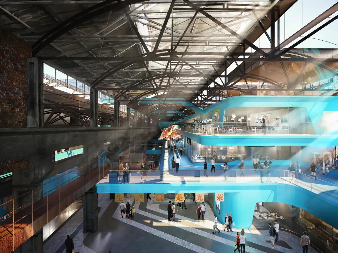 室内中心通过置入现代主义风格的“活力芯”,激发室内空间的无限活力;场地中东侧原有的附加体量、南侧的排架以及西侧的烟囱等工业元素,通过改造更新,成为场地中特殊的活力点。前沿的设计语言结合老工业基地的独特气质,将这里打造成济南城市中心的广场和后工业风格的公园。