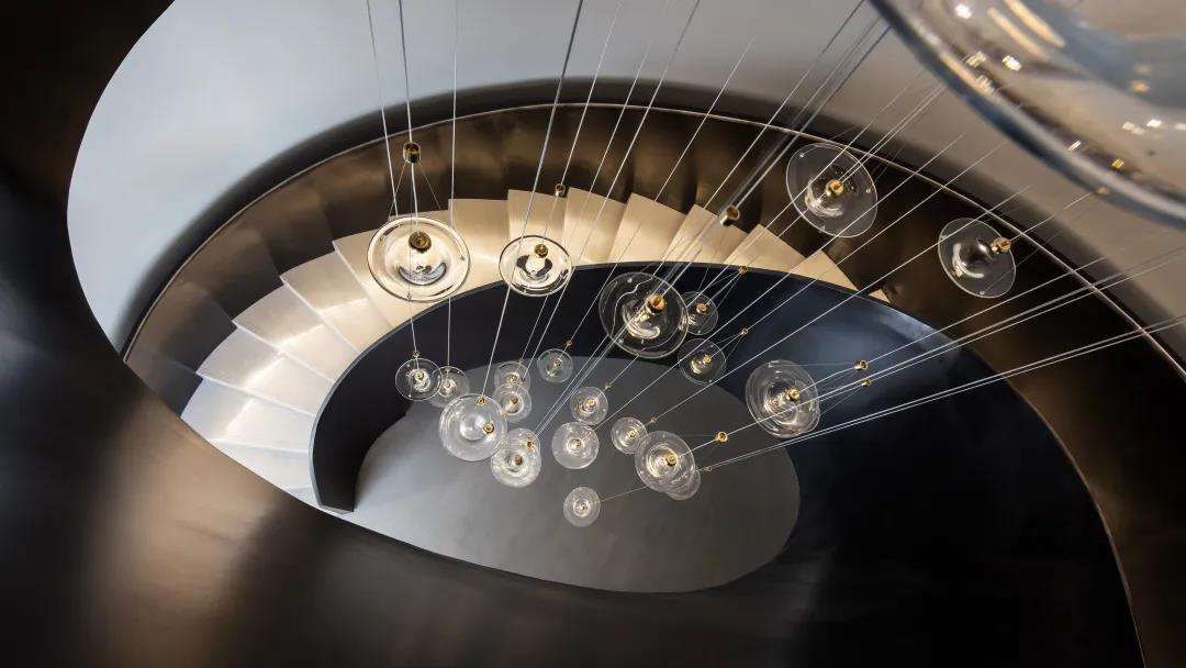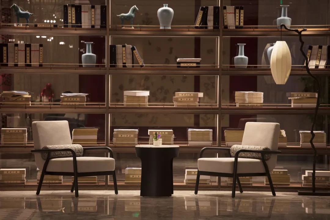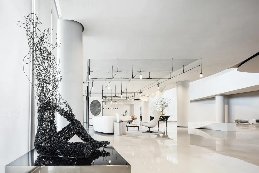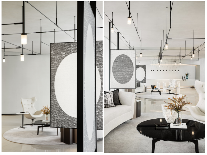 开阔明亮的空间透过硕大的落地玻璃幕墙,打破其封闭性,将户外景致纳入其中。倒悬的装置“山”占领的巨大的空间,与地面上水墨画的“水”相呼应,营造出一种别样的诗境。当代艺术家申凡的授权名作《标点》系列画作悬挂于此,从细节处将“无穷”的设计思想贯穿始终。