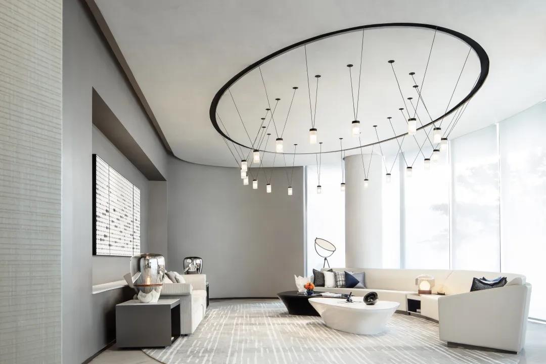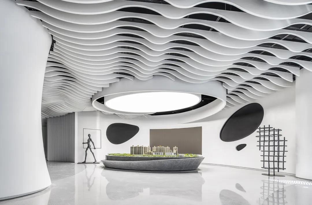展示厅以现代感的线条勾勒出高低起伏的空间节奏,谱写出和谐的设计韵律,平滑、流畅、自由是空间的主要语言。曲线的感性与自由之感以独特的造型让人眼前一亮,游走的线条在承启转合间呈现出现代美学,也为空间创造出了更多的可能性。