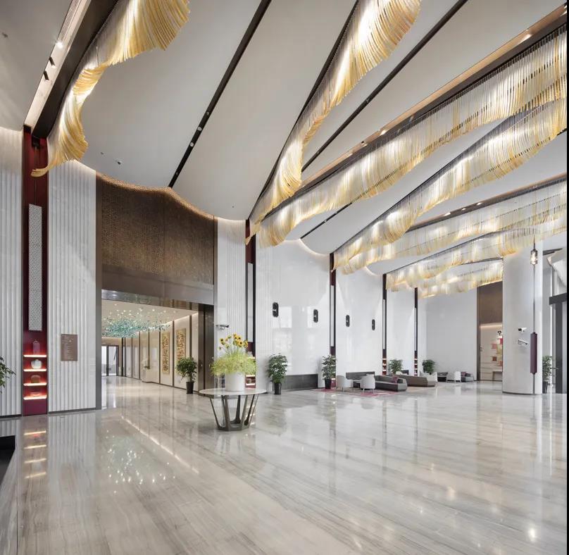 建筑规制方面,大堂天花飞檐的造型,层层叠叠与整体的异形空间契合。墙面有着仪式感的壁龛造型,隐喻主人规格的仪仗提着灯笼捧着器皿,迎接远道而来的客人。中式建筑规制最高级别的重檐屋顶,以最正宗的方式内隐于门洞上方,别有洞天。