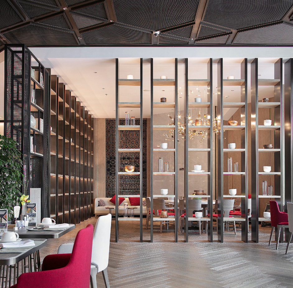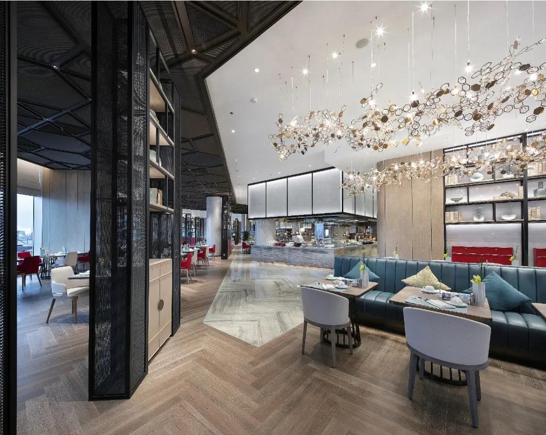 全日餐厅,贯穿整个区域的主管线喷白半开放处理,覆盖以三枝六椀为骨架的铜色金属网,体现了艾美餐厅的后现代艺术调性。