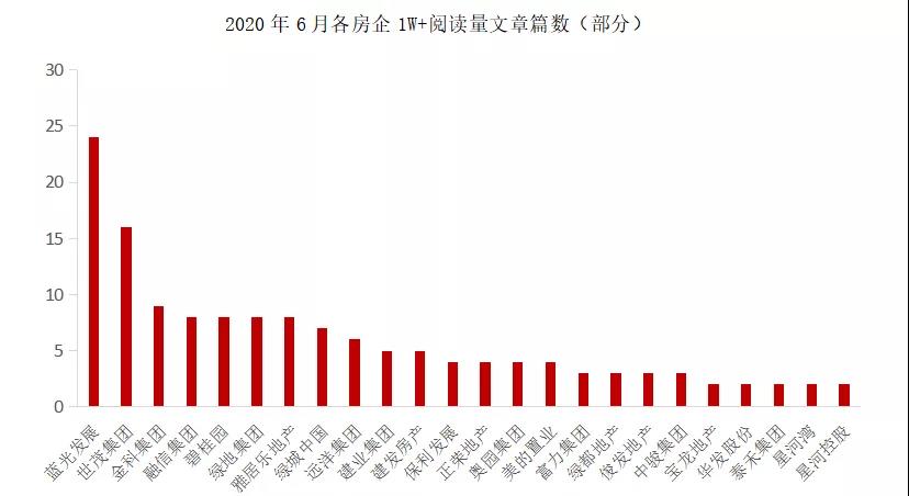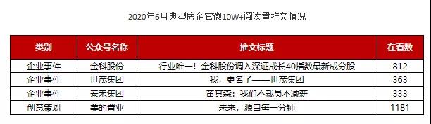 整体来看,虽然6月份产出阅读量的1W+亮点文章的企业数量有所下滑,但仍有多家企业有亮眼表现,如蓝光发展、泰禾集团、星河湾等。值得一提的是,蓝光发展本月以《蓝光创业史》内容、产品塑造能力等方面为核心,在官方微信平台重点展现企业多维品牌形象塑造,获得持续关注。