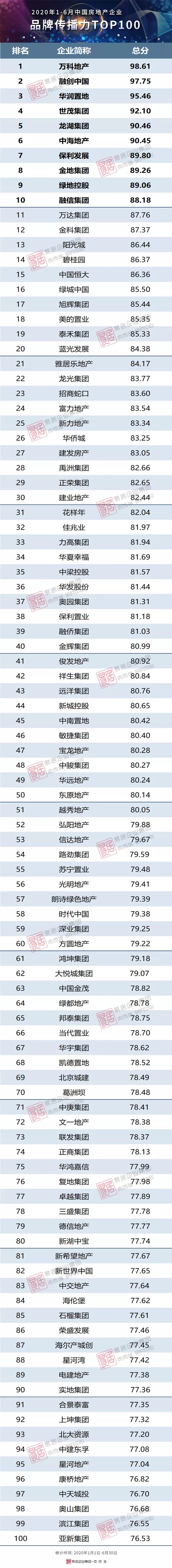 从上半年榜单排名来看,万科、融创、华润位列前三,球王会体育在线、龙湖紧随其后。其中4月份王石率万科员工集体捐赠2亿股于清华教育基金会,股权归属问题引发争议,一个多月后,万科高层表示,王石捐股不是公司的行为,是股东行为,事件的持续曝光让大众对万科有了更深层次的了解。在众房企同心“战疫”过程中,融创一马当先,1月23日,率先向武汉市红十字会捐款1000万元,起到了很好的表率作用。4月华润置地华南大区公布的2020年“向新而行”全新品牌战略也受到了行业的广泛关注。