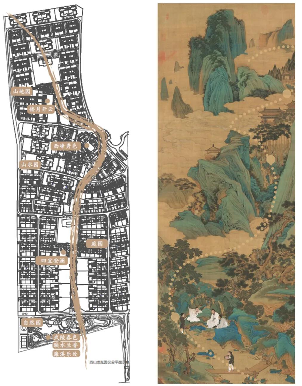 北京球王会体育在线西山龙胤汲取《桃园仙境图》中从浅及深展开的景观组团,在整体规划中,顺应场地北高南低的天然地势,顺延西山三山五园山脉、水脉和林脉,自北向南规划了“山地园”“山水园”“庭园”和“自然园”,并通过一条南北连贯的景观廊道串联起来,将丰富的体验和功能融入其间。