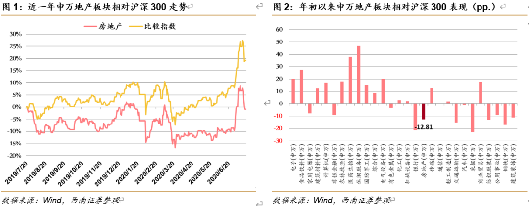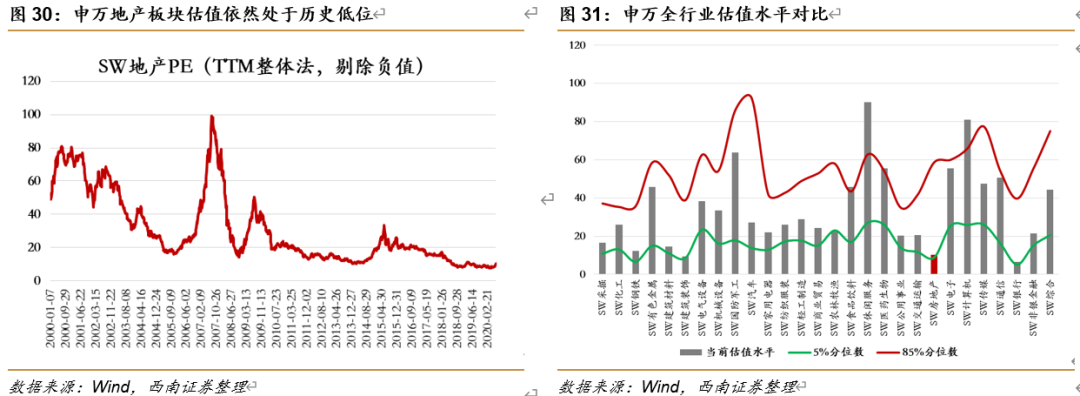 2020年1月上旬是地产股的阶段性高点:其一是地产股自2019年11月下旬的估值修复历时一个半月,从时间和空间上修复较为充分,其二是从预期、政策和企业方面均出现程度不一的利空因素(2020年货值储备和销售目标下调、央行继续严控房地产新增贷款占比、融创中国配股等)。之后经历过两次比较明显的风险事件冲击:1)武汉封城后中国疫情的冲击,这一次冲击较多为心理影响,2月4日开始修复较快(基本一个月左右),部分地产股随之有不错的反弹(有的甚至创新高);2)境外疫情冲击,叠加阶段性的流动性风险和年报窗口期(部分房企经营目标或业绩的下修),政策宽松落空导致板块下跌的动力更大,历史半个月及调整到更深的位置。从3月下旬开始,超跌反弹再次进入修复阶段,但个股表现出显著的分化。5月两会结束后,对政策预期的调整结束,销售持续向好促进了地产股的反弹。从位置上看,3月下旬是个股的低点,从趋势上看5月底是地产股反弹的起点。