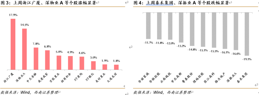 从个股涨跌幅来看,上周浙江广厦、深物业A、中天金融等个股涨幅居前。泰禾集团、深振业A、格力地产等个股跌幅居前。