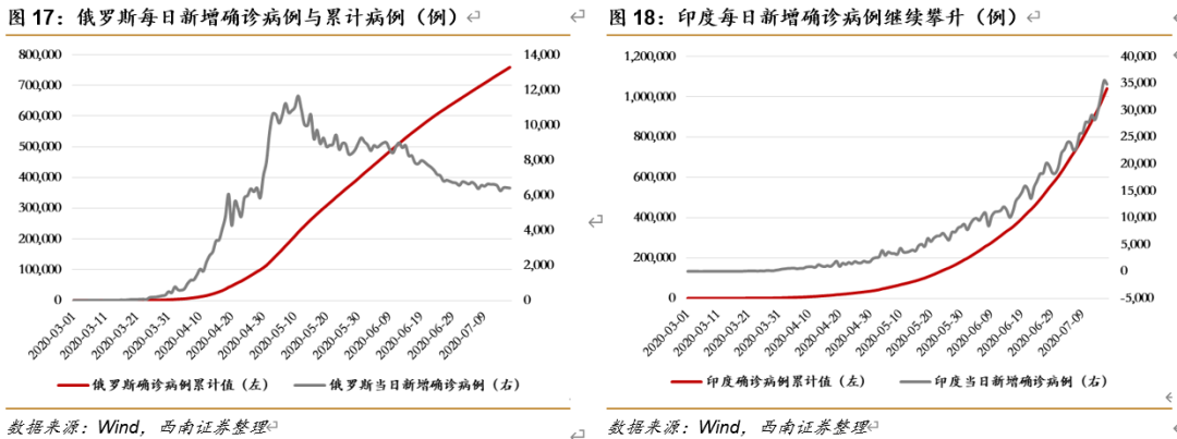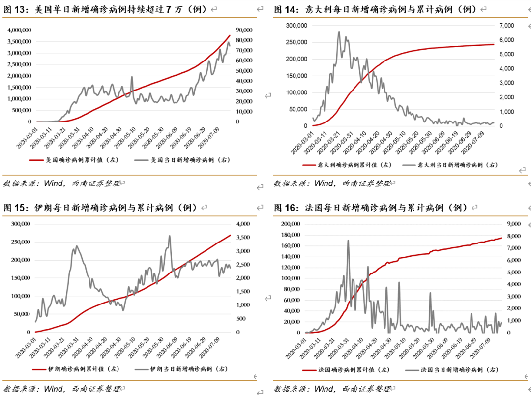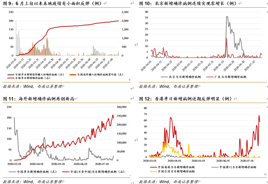 本周值得关注的主要有:1)香港地区近日疫情持续恶化,7月16日新增67个新冠肺炎确诊病例,创下单日新增新高,其中有63例是本地病例;2)新疆地区近期疫情呈现抬头态势,7月17日新增本土病例16例,乌鲁木齐已启动疫情应急响应预案;3)7月17日全球累计确诊病例突破1400万,单日新增病例维持在20万例以上;3)近周美国新增病例大幅反弹,7月6日美国累计确诊病例首次突破300万,每日新增已连续三日超7万例。