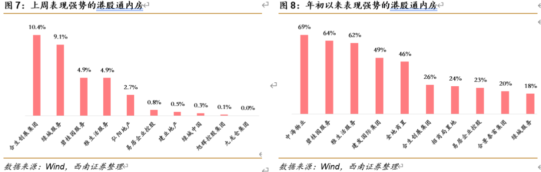 从港股通内房(根据Wind-港股概念类-内房股,且为港股通标的)表现来看,上周仅有9只股票上涨,合生创展、绿城服务等涨幅明显,而太阳城、佳兆业、恒大、恒隆地产等位居跌幅前列。年初以来,中海物业、碧桂园服务、雅生活服务、建发国际、金地商置等个股表现强势。上周从成交金额来看融创、恒大均超过20亿(人民币)。