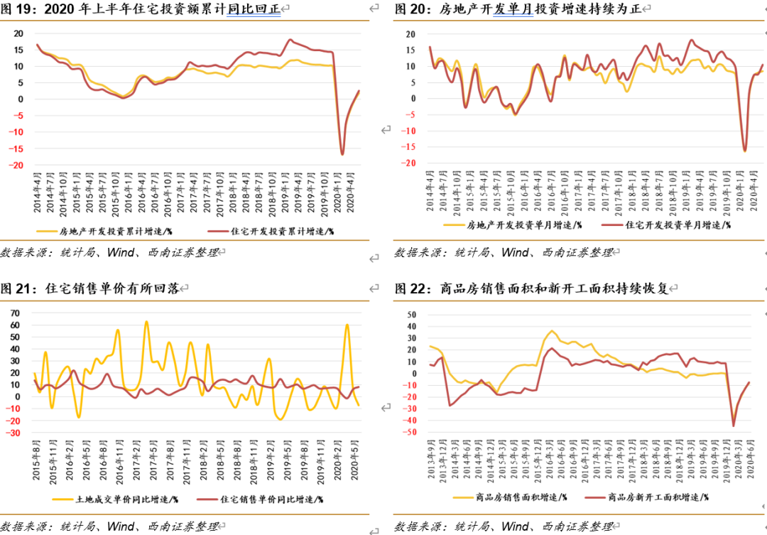 2020年6月住宅新开工增速回升,竣工增速回落。2020年6月住宅新开工面积同比增长9.7%,比前值大幅提高10.6pp,2020年上半年住宅新开工面积累计同比继续收窄,增速为-8.2%,比前值提高5.7pp。2020年6月住宅竣工面积有所回落,同比增长-4.63%,比前值回落-14.4pp,2020年上半年住宅竣工面积累计同比继续收窄,增速为-9.8%,比前值提高1.1pp。