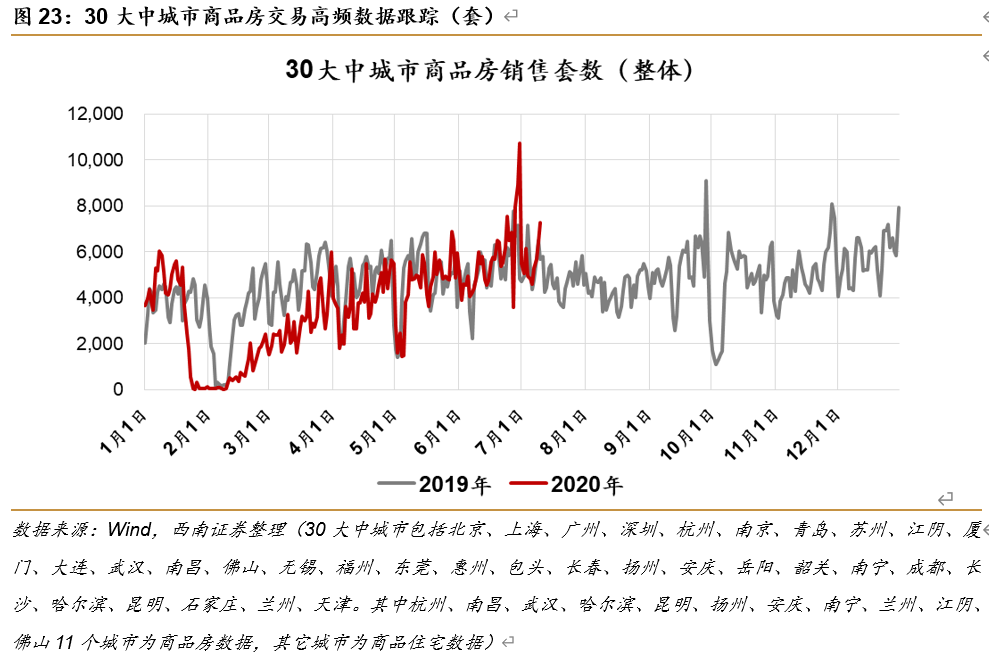 根据30大中城市新房交易高频数据:2020年1月20日,商品房成交套数为3662套,环比下滑31.5%,之后五个自然日的交易套数分别为2349套、1499套、523套、59套和21套,之后交易量开始持续恢复,4月最后一周成交量已恢复到2019年平均水平的85.7%。今年五一(2020年5月1日-5月5日),30大中城市新房日均交易1964套,与去年同期相当。5月日均成交量4564套,同比下降5.0%。6月日均成交量5699套,同比增长8.2%。过去一周(7月11日-7月17日)日均交易4741套,相比2019年日均4693套增长1.03%,环比前一周下降15.0%。