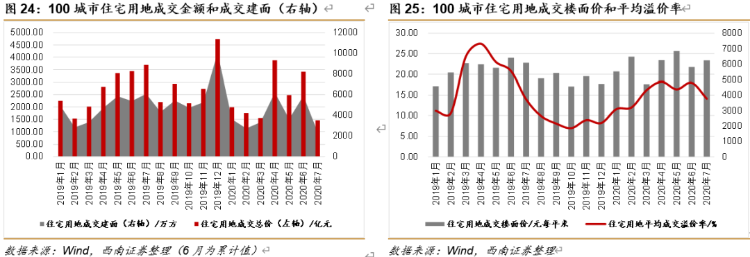 土地交易市场持续恢复。从土地成交情况来看,我们将样本城市扩展到100城市,根据Wind统计数据(含非房企购买的土地),2020年2月中旬以来土地交易持续恢复,特别是住宅用地和工业用地反弹较为明显。7月以来,100城市住宅用地成交2334.11万方,成交总额1454.99亿,平均土地成交溢价率为14.1%(1月、2月、3月、4月、5月和6月分别为11.57%、11.96%、16.18%、18.20%、16.37%和17.97%),平均楼面价达为6233.6元每平米,相比6月份有所上涨。