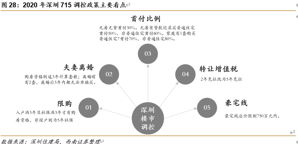 7月15日深圳楼市政策调控升级,或为40周年大庆做铺垫。本次深圳住建局出台的楼市调控政策可以归纳为5点:1)入户满3年且社保满3年才有购房资格,非深户门槛为5年社保;2)夫妻离婚,购房资格需要倒追3年按家庭合并计算套数;离婚前有2套,离婚后3年内都无法单独买;3)无房无贷首付30%,无房有贷款记录买普通住宅首付50%,非普通住宅首付60%,家庭有1套购买普通住宅7首付70%,非普通住宅80%;4)转让增值税从2年免征改为5年免征;5)豪宅线总价限制750万元内。其中最为核心的政策在于“3+3”的限购政策,近年来深圳落户即可购房,本次收紧户籍居民购房资格,也可一定程度上支持部分自住需求。深圳作为楼市风向标,调控升级进一步贯彻落实了“房住不炒、因城施策”的定位要求,也可能是为了2020年8月26日特区成立40周年做出一定预案和铺垫。