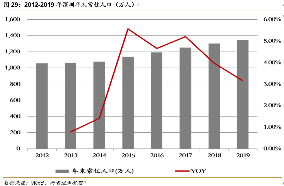 深圳楼市近两年来持续火爆,背后是深圳的人口吸引力。从行业特点来看,房地产属于典型的“供给约束”行业,由于土地二元制度和政府垄断稀缺土地资源,通过人口增速/销售增速等总量指标回落判断供过于求的拐点论经常会被证伪。地方土地供给约束叠加人口流动可以解释大部分楼市的结构性问题。从2010年开始,我国人口流动的最主要特征是“有选择性的流入中心城市”,人口流动的分化可以有力解释房价在不同能级城市涨幅走阔的现象。截止到2020年中,我国城市发展的核心问题依然是大城市依然不够大、数量也不够多、配套资源更加不足等。由于北京、上海已经开始控制人口流入和人口结构,深圳作为一线城市自然要承担更多人口流入的压力。