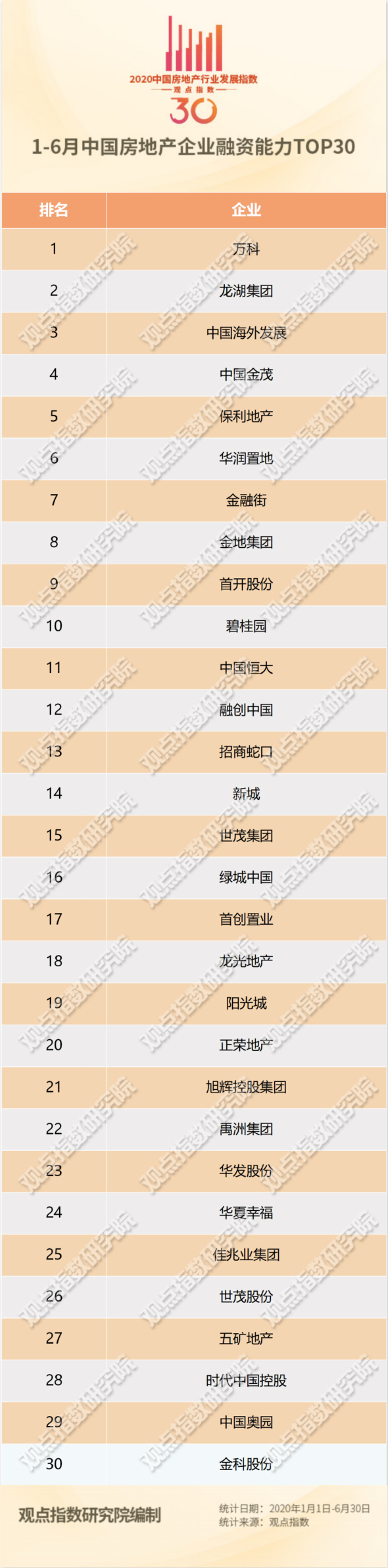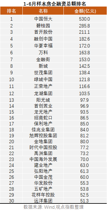 综合评价,万科在1-6月的融资发展榜单中名次继续提前。