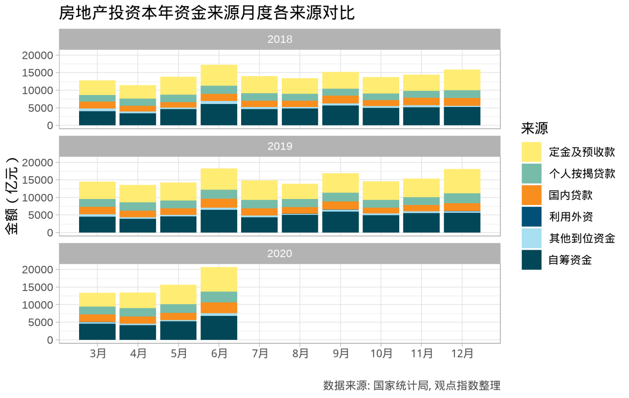 其中,个人按揭贷款和国内贷款部分较为平稳,从绝对值而言,各月变动不大。而自筹资金、定金及预付款部分各月变动较大,从而也推动了投资来源整体的波动。