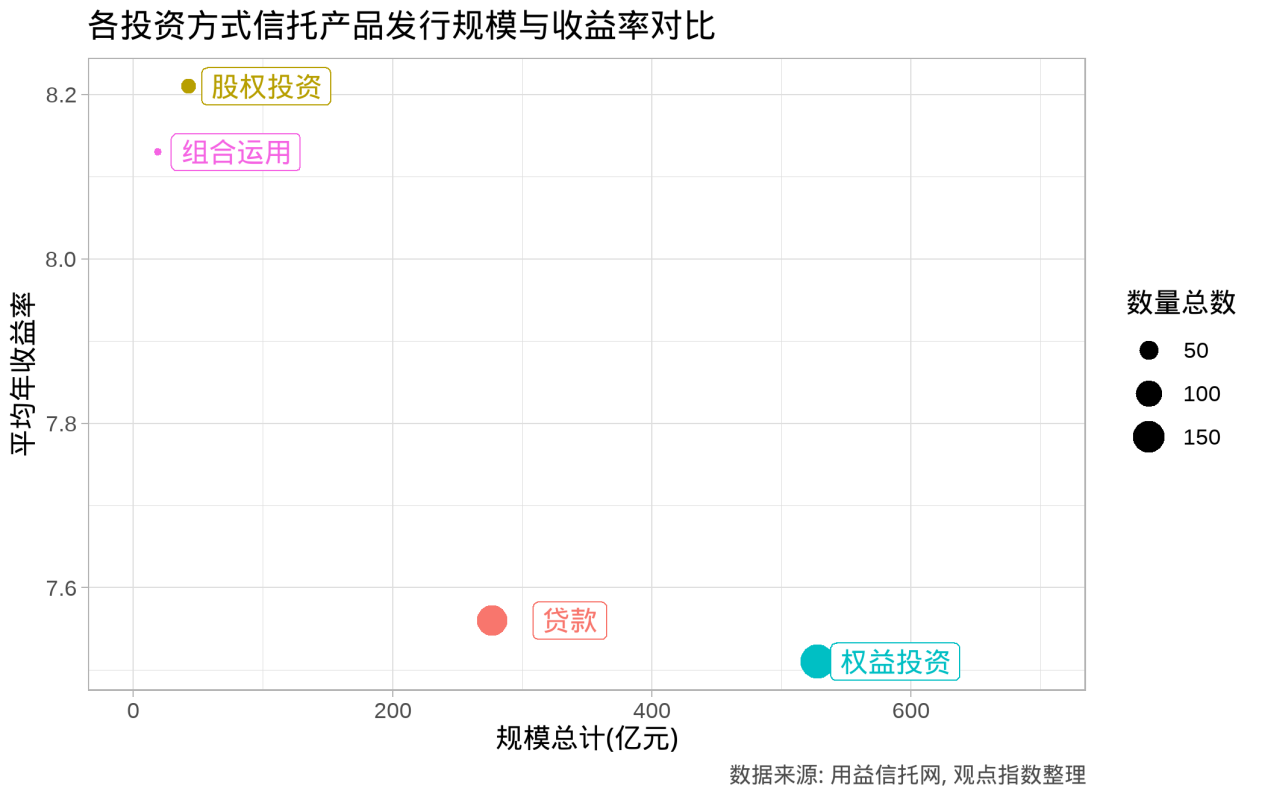要关注的是,运用组合投资方式的信托产品收益率略低,为8.13%,在所有类别中发行数量最低,发行总数为20只,涉及规模仅为19.04亿元。