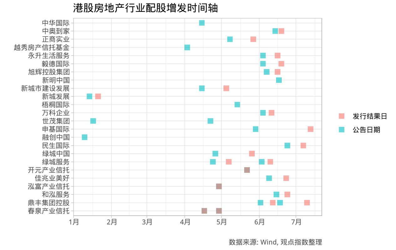 从港股房地产相关企业配股时间轴可以发现,1月初几家企业完成配股后,2-4月配股活动出现了停滞,这也与海外债券停滞时段相吻合。