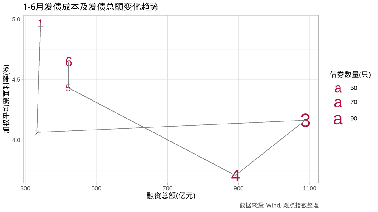 转看发债总额与发债成本的变化趋势,6月发债总额与5月基本持平,不过(融资规模)加权平均票面利率进一步攀升,仅次于1月的高峰。