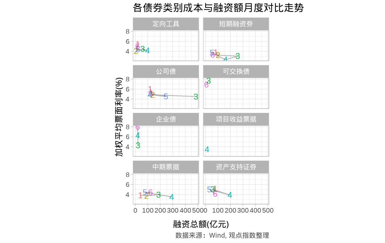 从各类债券融资成本(以加权平均票面利率计)与融资总额对比走势来看,公司债各月融资总额跨度最大,而企业债各月融资成本则相差较远。