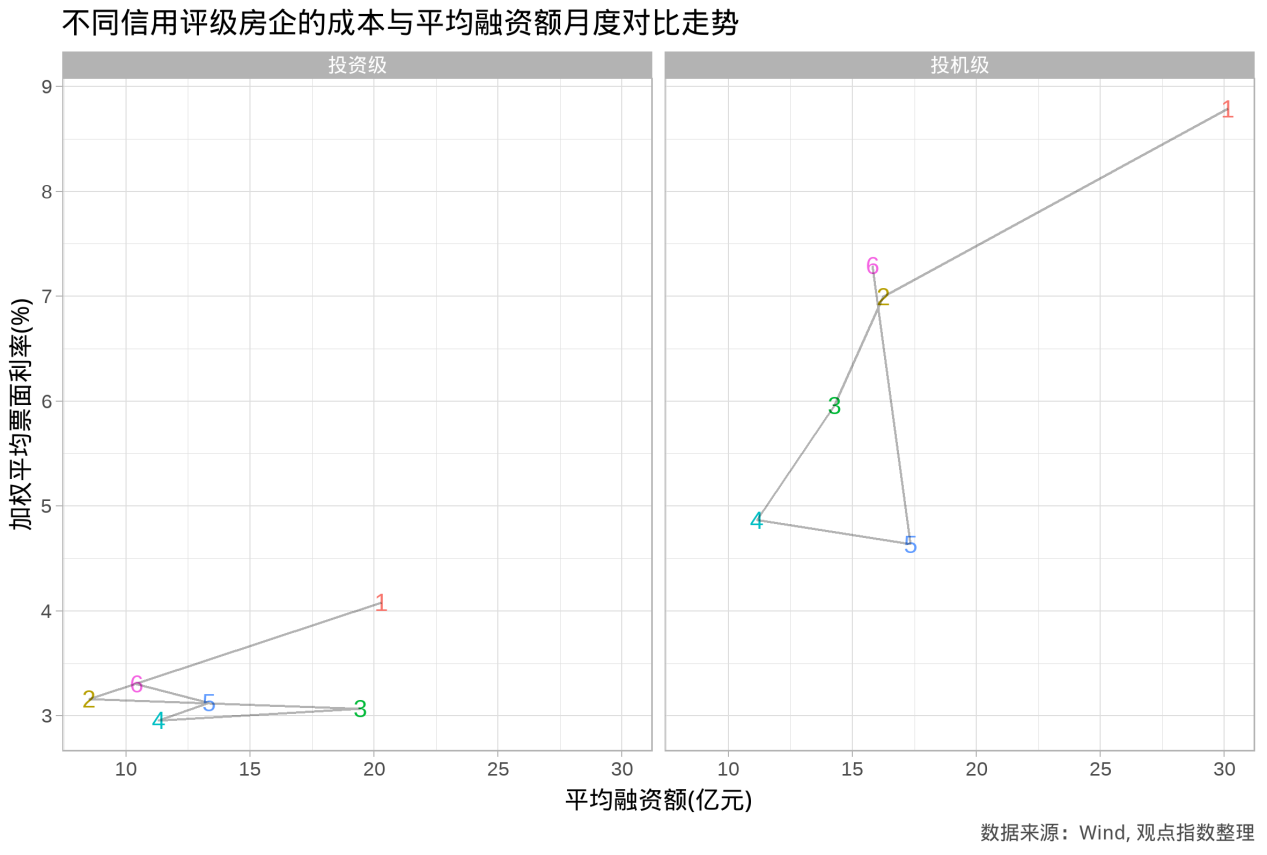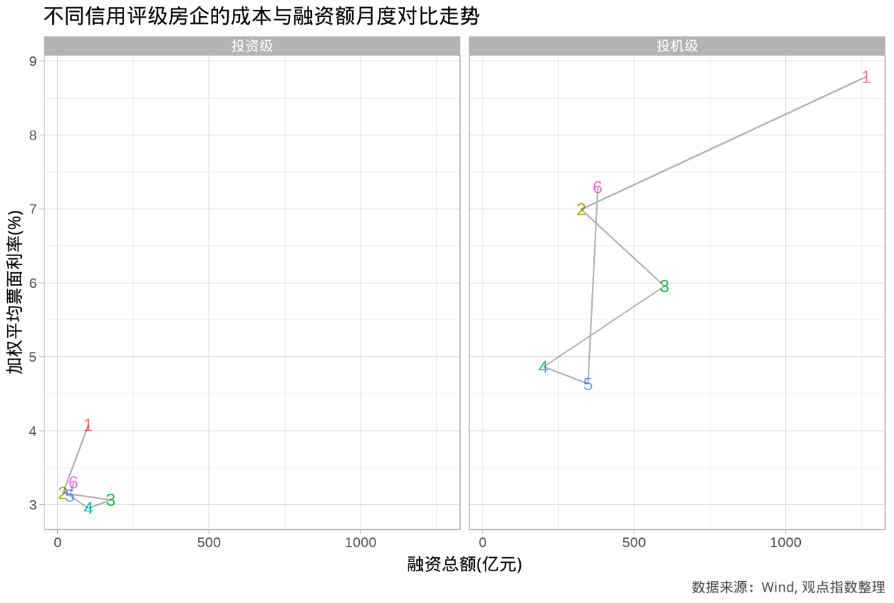 可以发现,投机级房企在融资票面利率和融资额上,显著高于投资级房企。