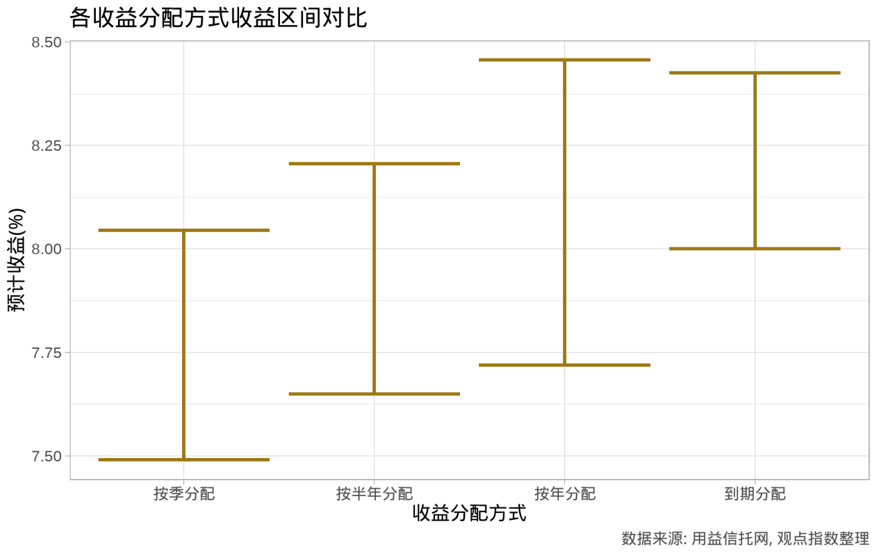 从用益信托网公布的信托产品收益分配方式来看,采用按季分配的信托产品最多,数量达94只,但平均预计收益也最低。此外,对比各收益分配方式,随着等待期的延长,收益也有一定程度的提升,图中上下限分别为产品预计收益上下限的平均值。