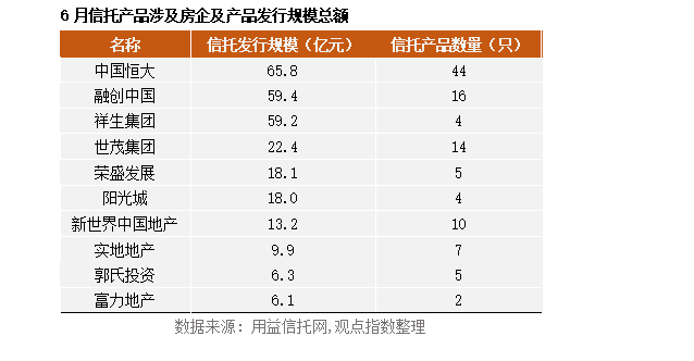 若根据信托产品融资方的公司信息,追溯到关联房企,可发现6月中国恒大一如既往在信托领域有较大参与度,恒大及关联公司通过融资方、担保方、底层资产提供方等方式参与了44只信托基金产品,共涉及资金65.77亿元。