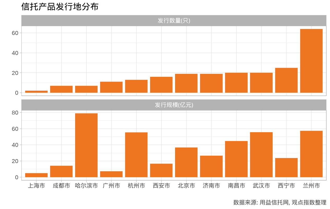 从发行地来看,6月公布的信托产品多发行自兰州市,哈尔滨市出现了规模超过10亿元的大型信托产品,而发行产品数量最多的兰州市,平均信托产品规模不足1亿元。