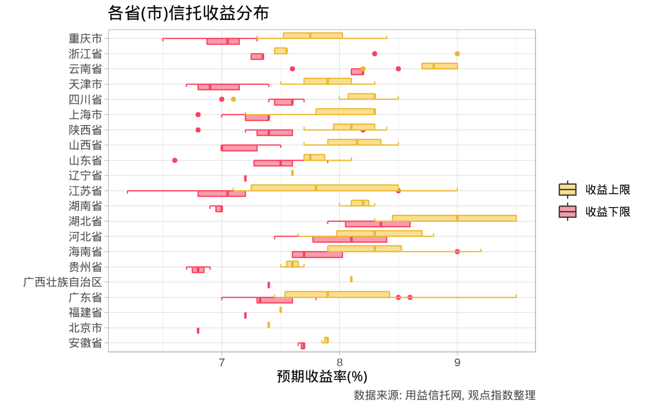 转看投向地区,6月开始,信托产品收益情况与上月相比分化扩大,其中投向湖北地区的信托产品预计收益率高于整体信托收益水平。同时,江苏、广东信托收益跨度也大于整体水平。