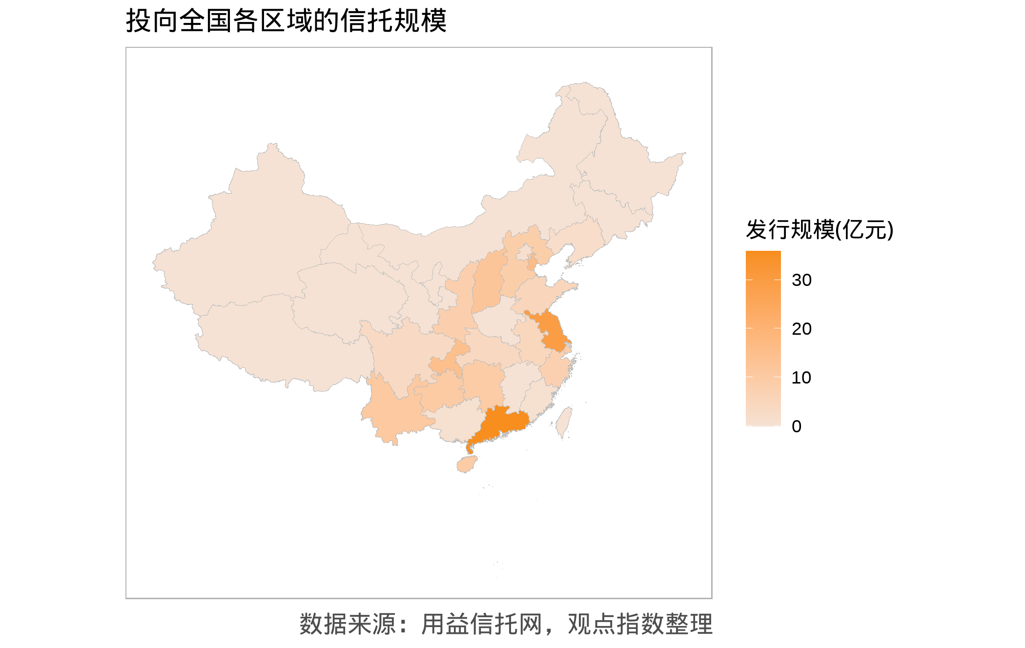 从投向各地区的信托规模来看,投向广东地区的信托规模最大,达35.89亿元,其次是江苏省,达29.45亿元。6月的信托产品投向较上月相比更加分散,募集资金投向地区超过20个省(直辖市)。