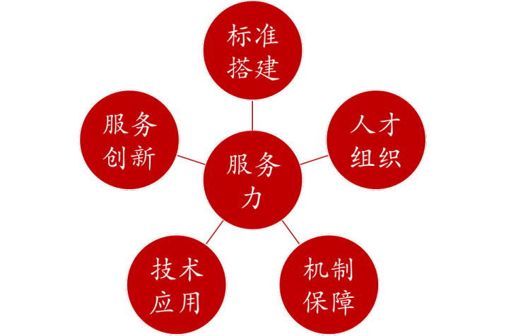 “服务力”即企业持续并创新性满足客户需求的能力。包括五大维度支撑,包括“标准搭建”,即服务体系设计搭建能力;“人才组织”,即吸纳、培养和匹配合适人才的能力;“机制保障”,即确保服务标准落地的能力;“技术应用”,即管理和服务数字化应用能力;“服务创新”,即创新性服务客户的能力。