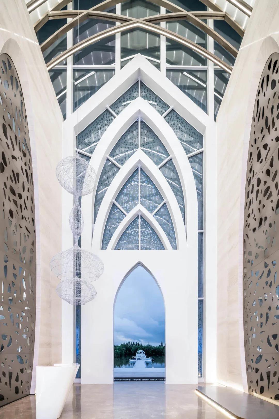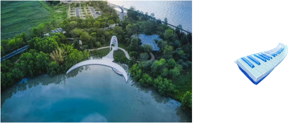 ○ 将艺术与建筑完美融合,在如镜的水面上,用优美流畅的曲线和上千个金属鳞片描摹出的鲲,静静地环抱在浪花艺术馆周围,姿态优雅,气象安详。这是我们对未来梦幻海岛生活的艺术镜像。