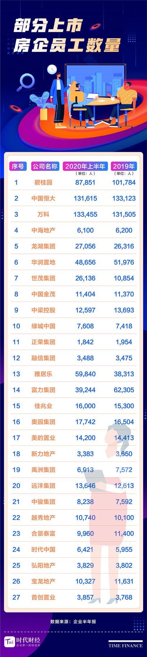 时代财经根据半年报统计的数据显示,过去半年,大多数房企的员工规模仍然保持着较为稳定的状态,未出现大幅度的人员增长或减少现象。数据显示,50强中有27家上市房企披露了截至6月30日的员工数量,其中21家房企的减员或增员幅度在10%以下。