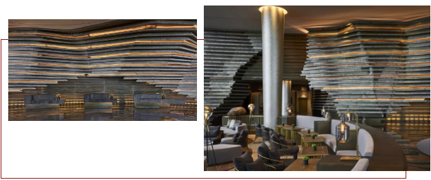 酒店大堂作为“地心奇遇”最核心岩层里的亮点,大堂立面隐约重现矿坑岩层的自然风貌,堂中央设有3D投影动态水幕,与户外的自然崖壁、远方的流水瀑布相呼应,模糊室内室外的界限。