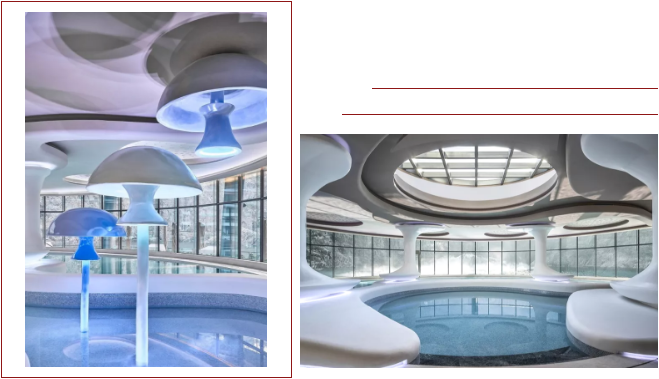 室内泳池位于碧泉溶洞位于坑底水面边际,由钟乳石抽象演化而成的天花与柱子造型,营造出犹如碧泉溶洞的氛围。透过玻璃幕墙,在戏水时也观赏室外雄伟的深坑崖壁,感受最特别的游泳体验。