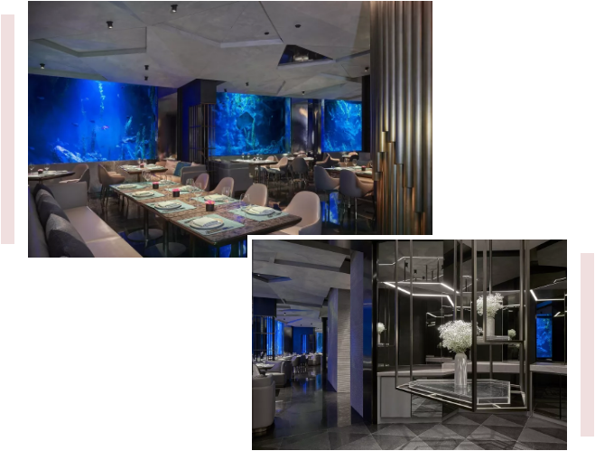 水下餐厅的天花造型与反射就像暗藏着连生晶体,炫彩斑斓,映射出和空间环境共鸣的美感。观望着水里的鱼群,点着蜡烛,在这里享受最特别的用餐体验。在“矿意美学”的氛围中,享受专属于上海佘山球王会体育在线洲际酒店的意境文化。