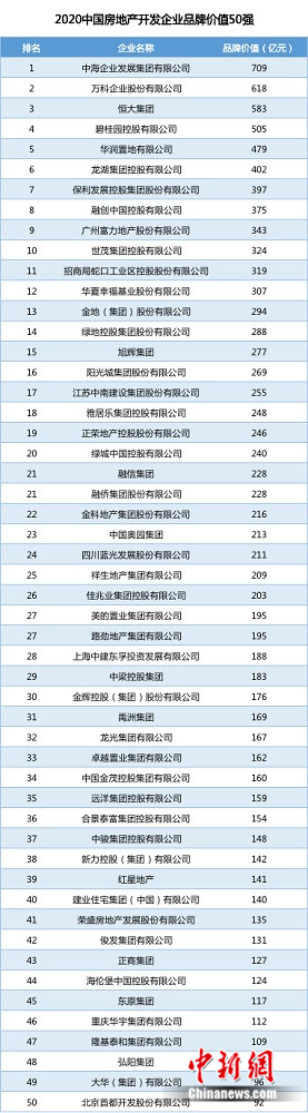 中新网上海9月17日电 (记者 于俊)“2020中国房地产企业品牌价值测评成果发布会暨房地产品牌发展高峰论坛”17日在上海举行,最新的中国房企品牌价值50强揭晓。这是中国房地产业协会、上海易居房地产研究院中国房地产测评中心连续第十年开展此项工作。