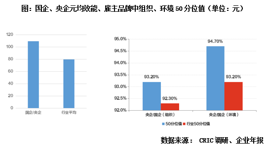 另一方面,国企、央企的稳定性优势凸显。从CRIC雇主品牌调研结果来看,在“组织”维度(组织发展、职能、效率)和“环境”维度(领导风格、企业文化、办公资源)两方面得分较高,其50分位值均高过两个维度的行业平均。