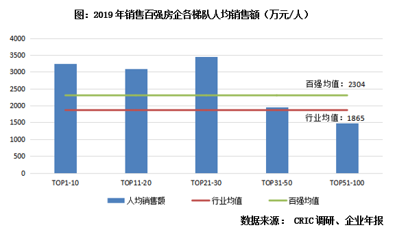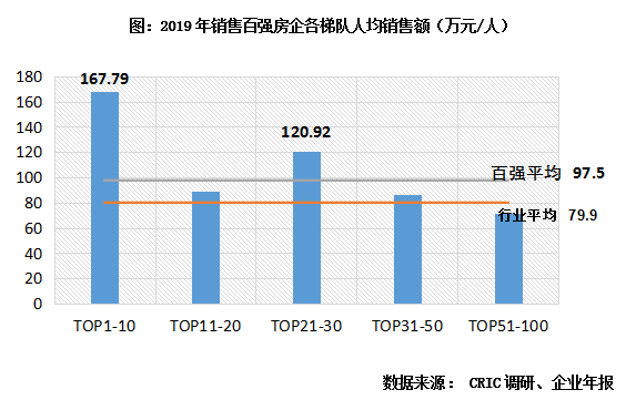 元效方面,2019年百强房企每花1元薪资成本可产生97.5元销售额。其中销售TOP10房企元效最高,保利、万科、滨江和中海等每单位薪酬成本产生140元以上的销售额。