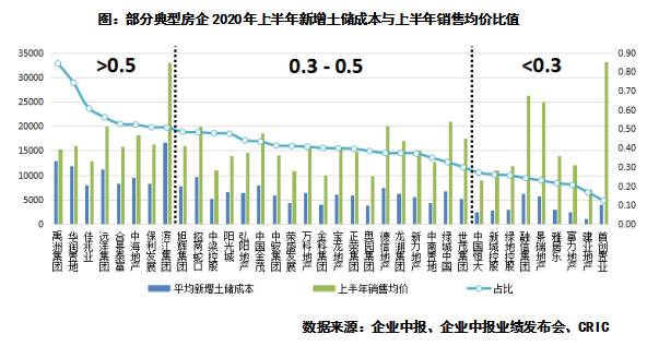 对比50家典型上市公司2020年上半年平均拿地成本和销售均价来看,有接近8成企业的新增土地成本都控制在销售均价的一半以下,以确保项目均有一定的盈利空间。