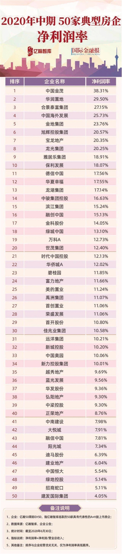 2020年上半年,50强房企实现营业收入总额19948.9亿元,占比全行业70.3%,行业集中度进一步提高。此外,19948.9亿元的数值虽然较2019年上半年的18346.9亿元同比上涨8.7%,但增速对比去年同期的19.8%大幅下降,在持续聚焦“房住不炒、因城施策”的背景下,房地产行业受到限制,销售增速放缓也导致公司收入增长放慢。