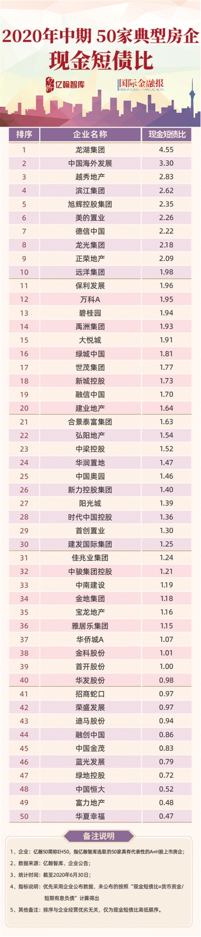 亿翰智库统计数据显示,2020年上半年,50家上榜房企平均现金短债比为1.56,较2019年底的1.72有所下降。