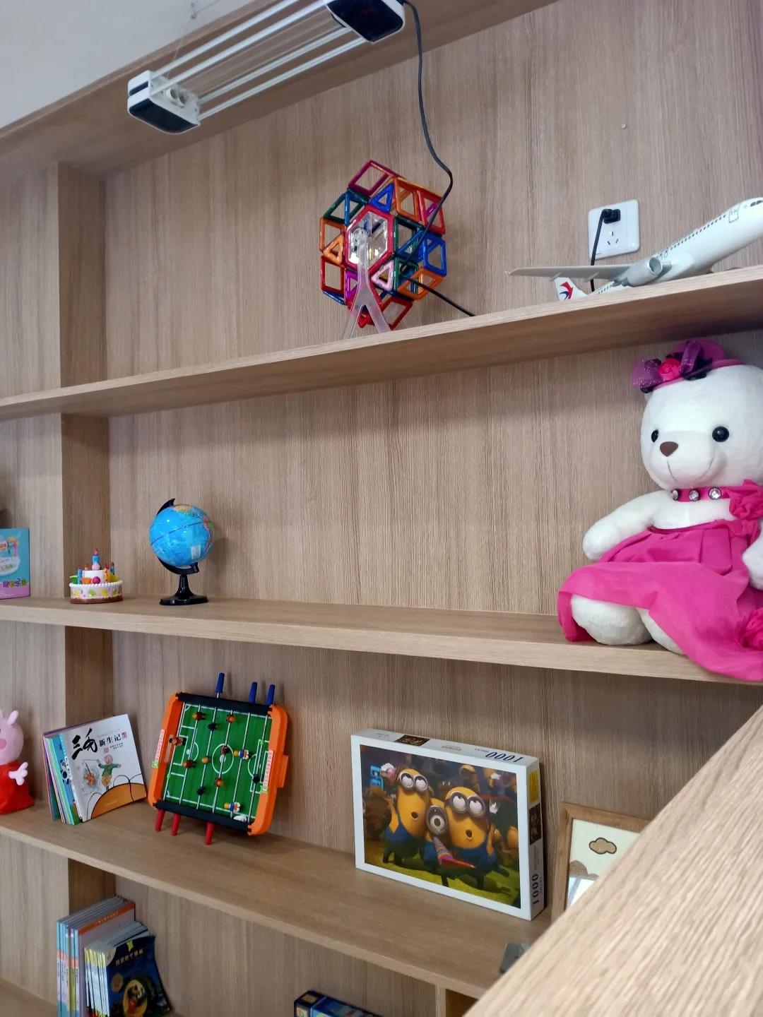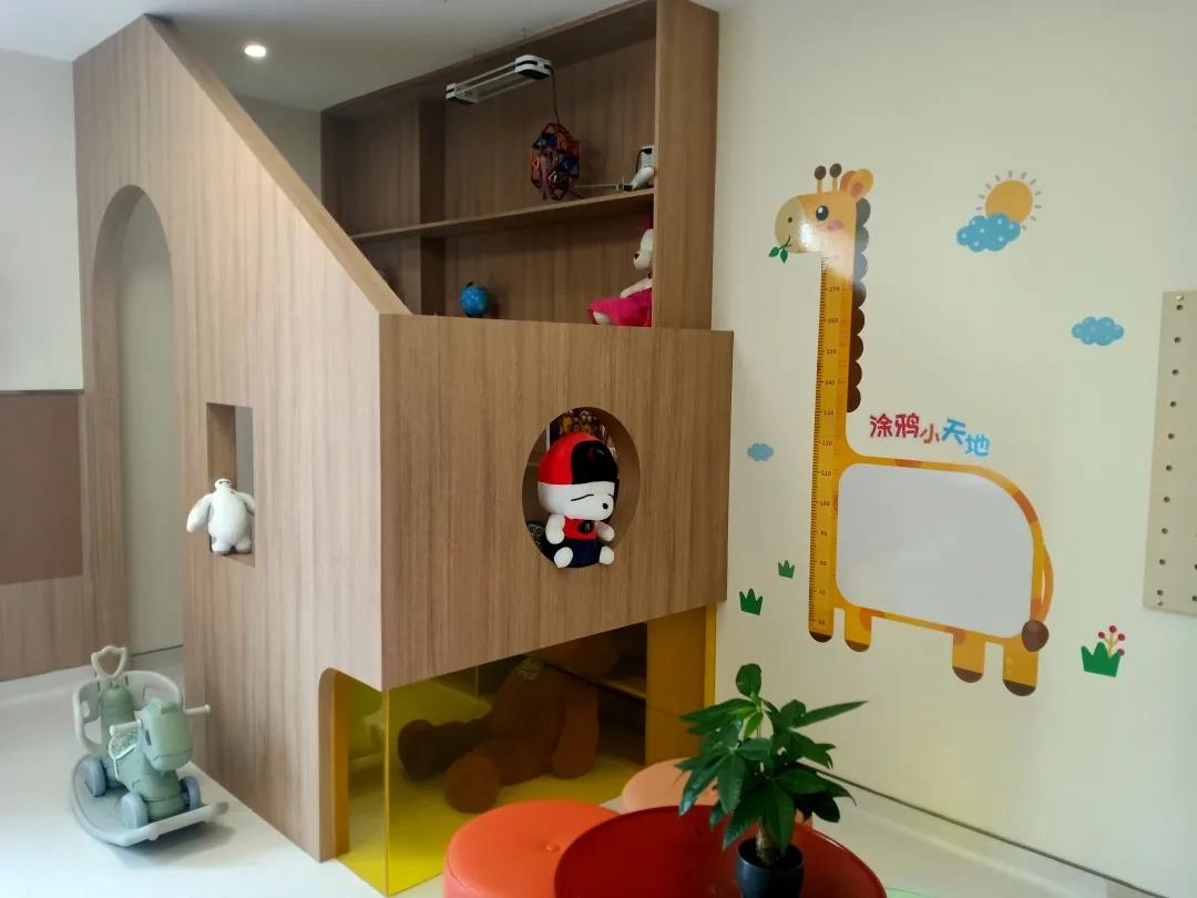 床的对面有一个神奇的树屋,里面住着各种各样可爱的玩具,他们都是孩子的好朋友,有他们在身边,一个人玩也不会孤独。墙上还有一只“肚皮”大大的长颈鹿,这是给小天使们用画笔画下心中梦想的园地。床的对面还有衣柜、冰箱与微波炉等简单的厨房电器,让这里更有家的感觉,温馨而亲切。