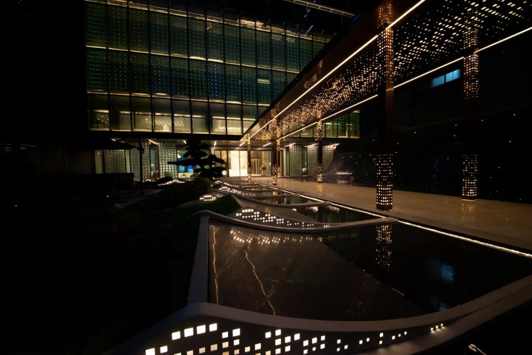 进入厅堂首先映入眼帘的是一个带有水面连廊的精雅庭院,水面石材采用钻石石材,石材中交杂着水晶,在夜晚,在自然光的映射下,潺潺流水中仿若置入茫茫闪烁星空,给人的第一感觉就是梦幻,而后是极致的放松。