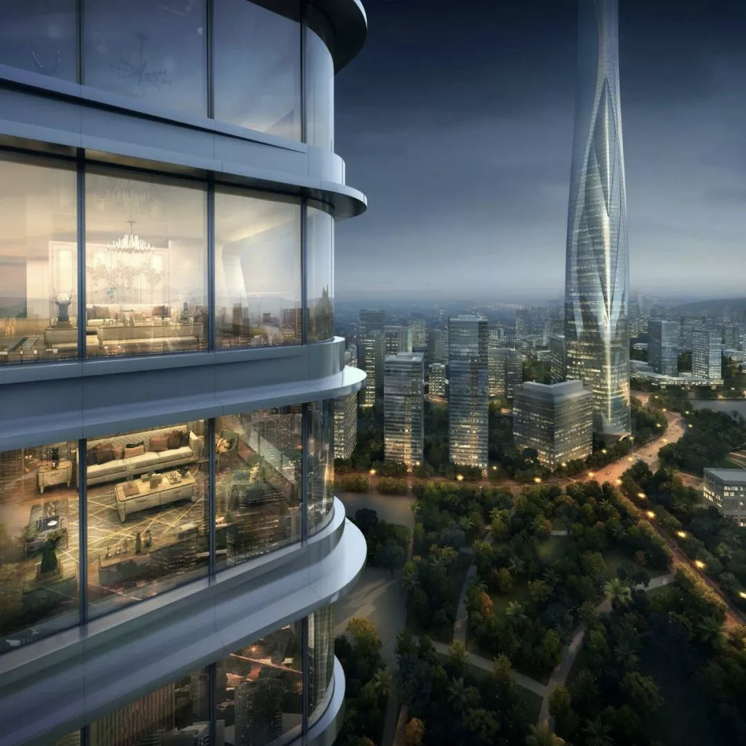 东地块以1栋高塔、4栋超甲级写字楼和约31万平航母级商业组成;西地块包括一、二期公寓,其中点缀着包括演艺中心、会展中心、国际学校、图书馆、美术馆在内的大量公建配套。