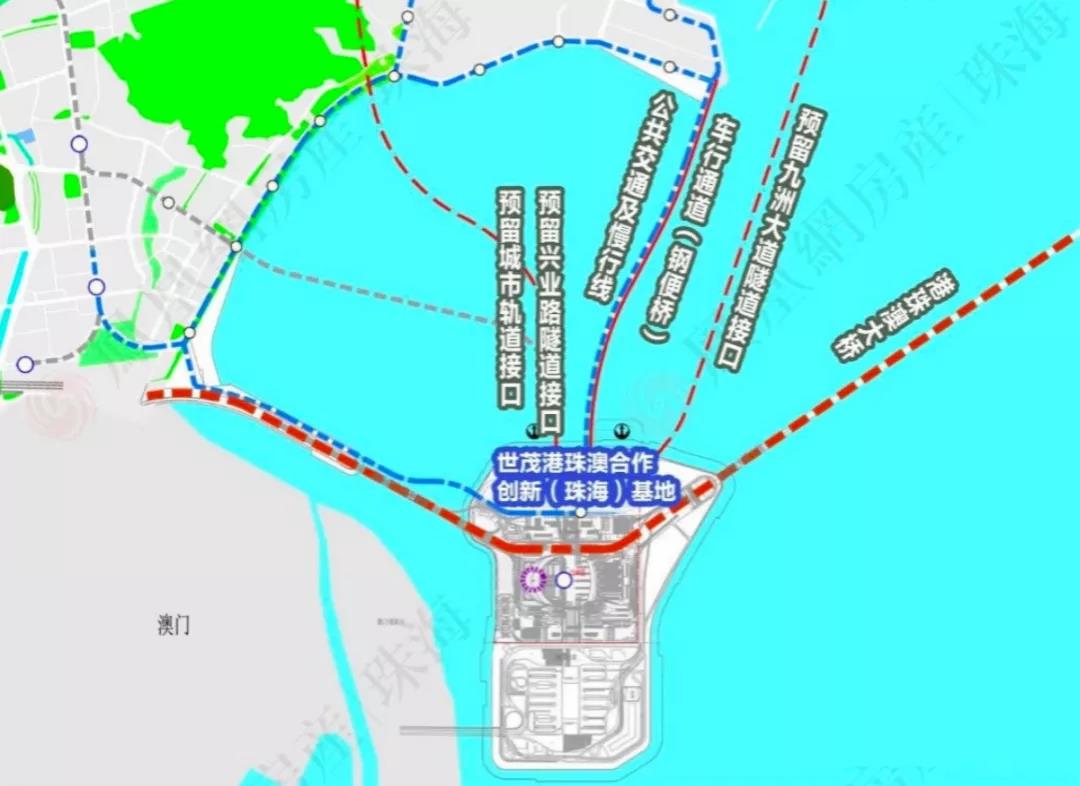 其位于珠海口岸和联检大楼北侧,将有交通连廊连接口;同时,项目南侧规划有交通中心,预留城市轨道站点、有轨电车站点、公共交通线路等都将从经由此处进出。