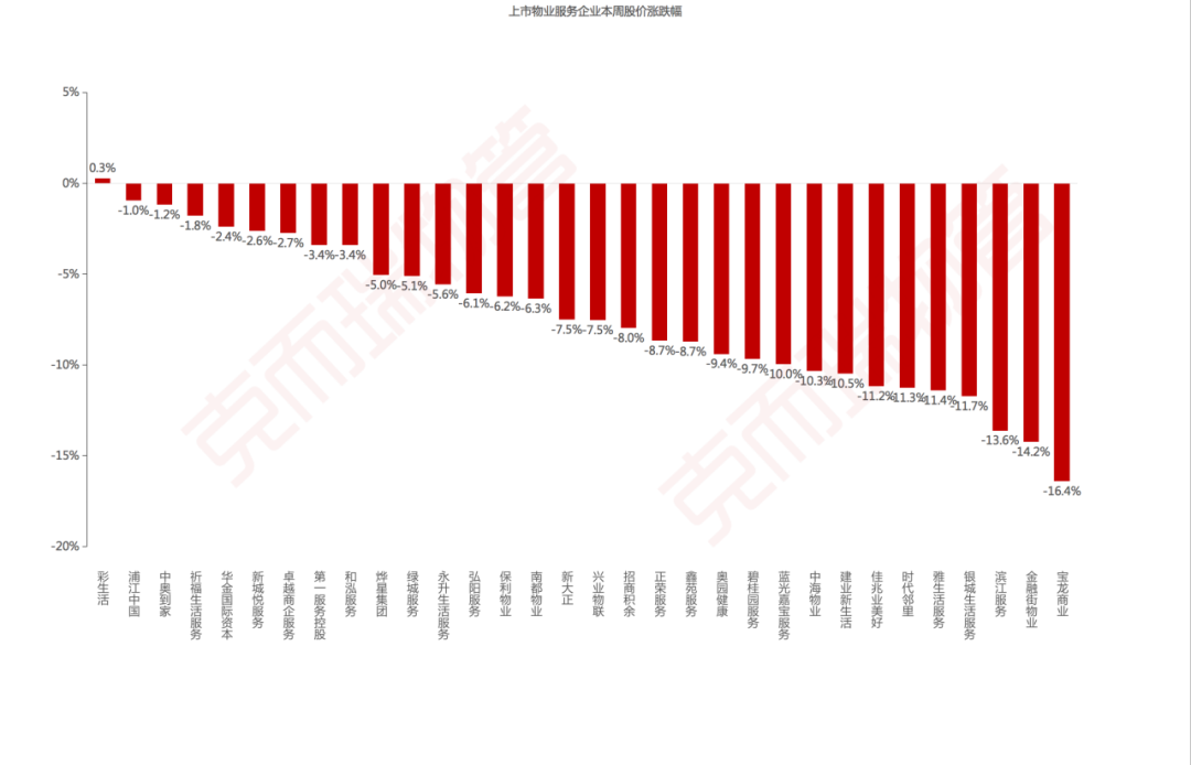 本周物业管理板块整体呈现下降趋势,32家企业仅有彩生活1家企业股价呈微弱上升趋势,平均跌幅达7.27%。
