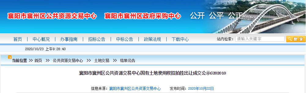 10月22日,襄州土挂告字[2020]10号地块成交,襄阳盛世百洋企业管理有限公司以总价27762.19425万元(约2.8亿元)摘得该地块。