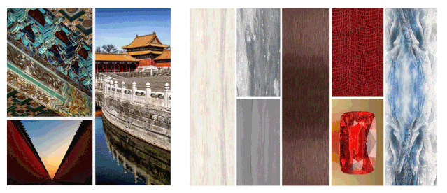 色彩搭配方面,从故宫建筑用色找到背后隐藏的传统五行色,因循五行相生的逻辑关系,以白(金)、灰(水)为主,黄(土)、蓝绿(木)为辅,以红(火)为跳色。配色方案符合“中性色为主,冷暖色为辅”的时尚设计理念,又完美融入了皇家艾美品牌的橘黄主题色。
