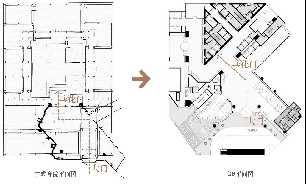 酒店主入口位于静谧的九江路上,循门而入,视野瞬间开阔。主入口二进院落即分前后两院,同时轴线错开,不得窥其内容,延续传统中式逻辑,通过增设垂花门,使G层入口大堂成为“前院”,垂花门内为酒店伊始。