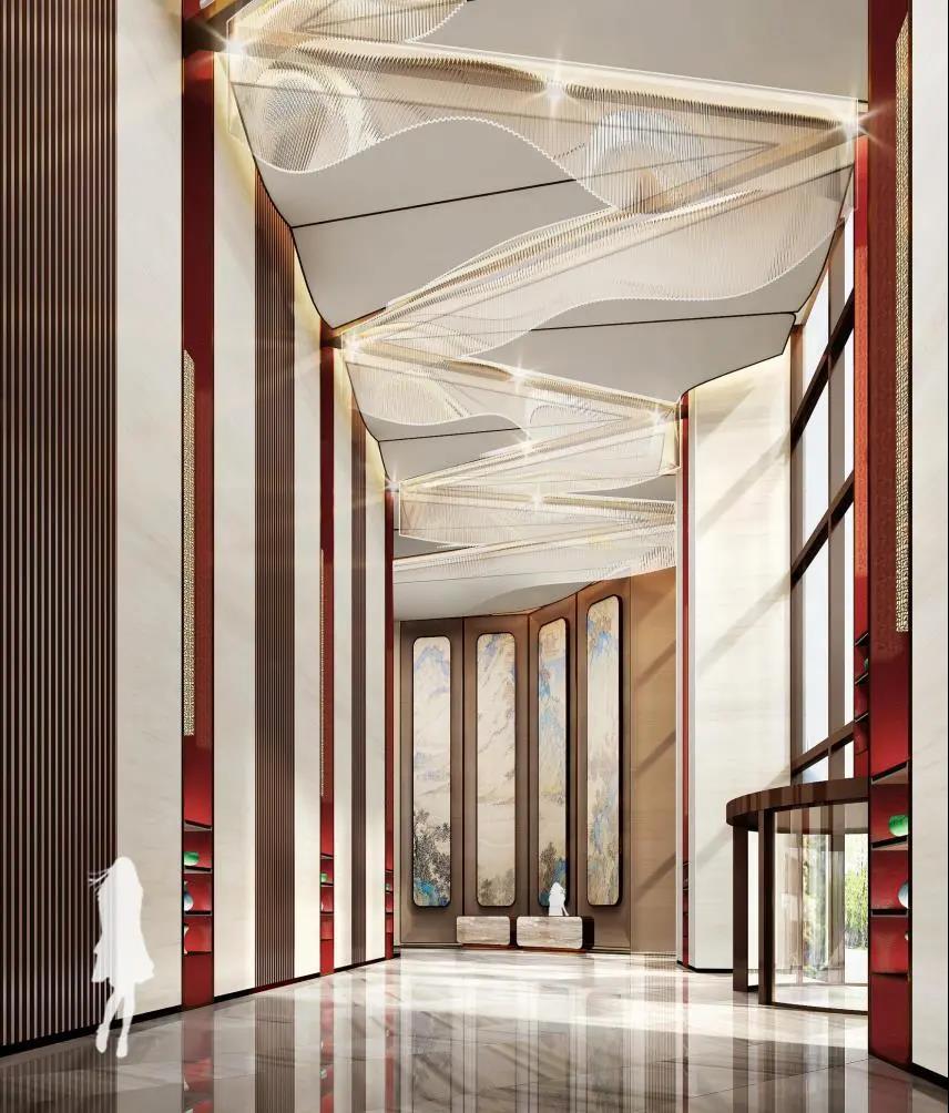 凤楼观晓日,紫气正东呈。G层大堂吊顶造型源自古老而神秘的凤鸟图腾,片片曲弧如翼似飞,形态万千。带状水晶灯萦绕其间,似银河泛波,又似朝霞微露,宁静深邃,缓缓飘至大堂门头。